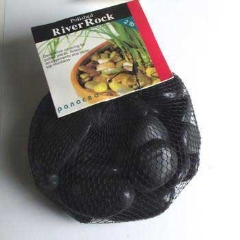 Polished river rocks is packaged in 2 pound bags. Great for use in aquariums as well as planters. Available in black color.